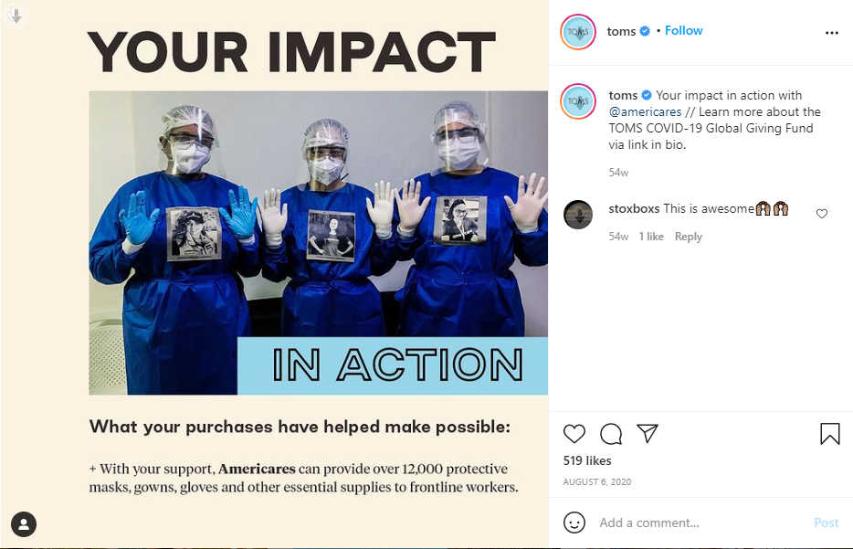 Rather than just ‘promoting’ how sustainable your business is, show the benefits and positive effects that your choices are having on the world. Make your content about your customers and how making positive choices makes them feel. Addressing the audience as ‘You’ and ‘Your’, makes the content personal to the user. Providing stats, for example as used below by Toms, explains that buying from them has a positive knock-on effect and will make the buyer ‘feel’ good.